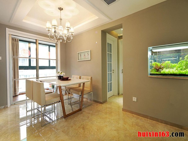 餐厅的设计比较光亮和开阔,白色的石膏板吊顶搭配上一个大型的水晶灯瞬间提升餐厅的明亮度,一套白色皮质餐桌椅更是让餐厅的气氛明亮又舒适,餐厅的侧面是一个玻璃的隔断让家装的各个区域的通透度更加的充分,餐厅墙面上悬挂一个长形的壁画更是为这个空间增加了几分艺术气息。